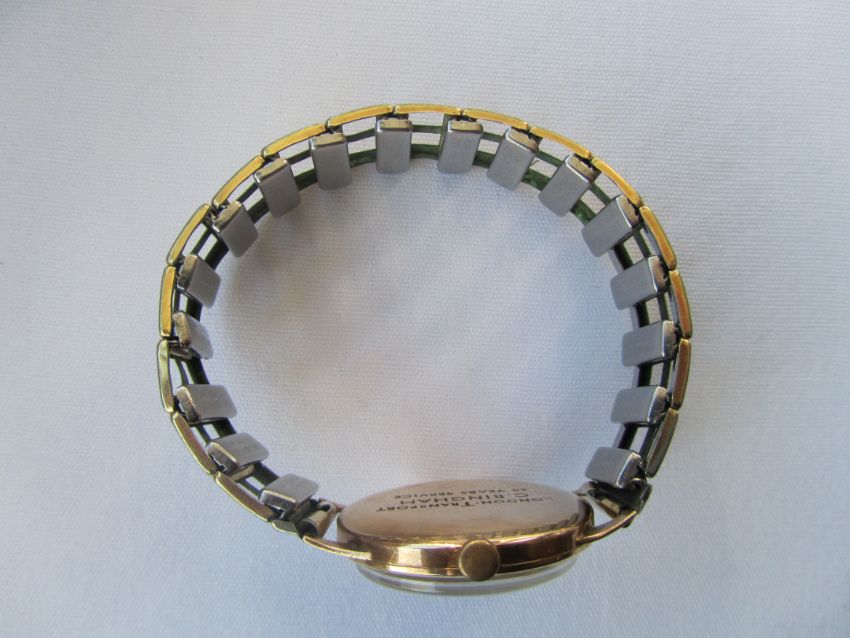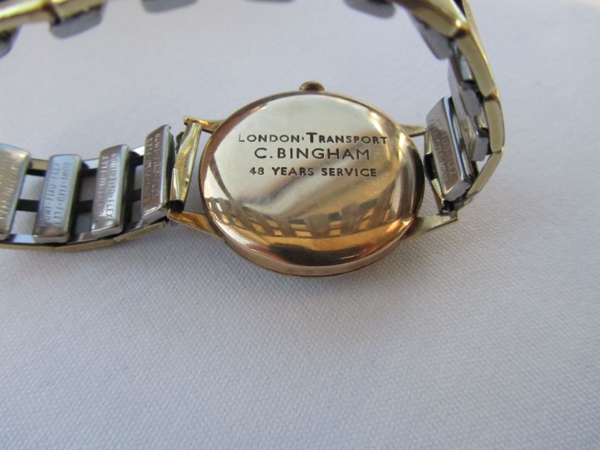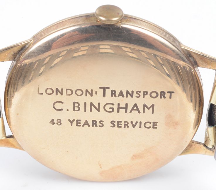 the white dial with Arabic hours, subsidiary seconds dial and dauphine hand, in a circular case, with associated elasticated bracelet, case number: 12649, the case back engraved 'London Transport C. Bingham 48 years of service' with original Tudor marbleised box.