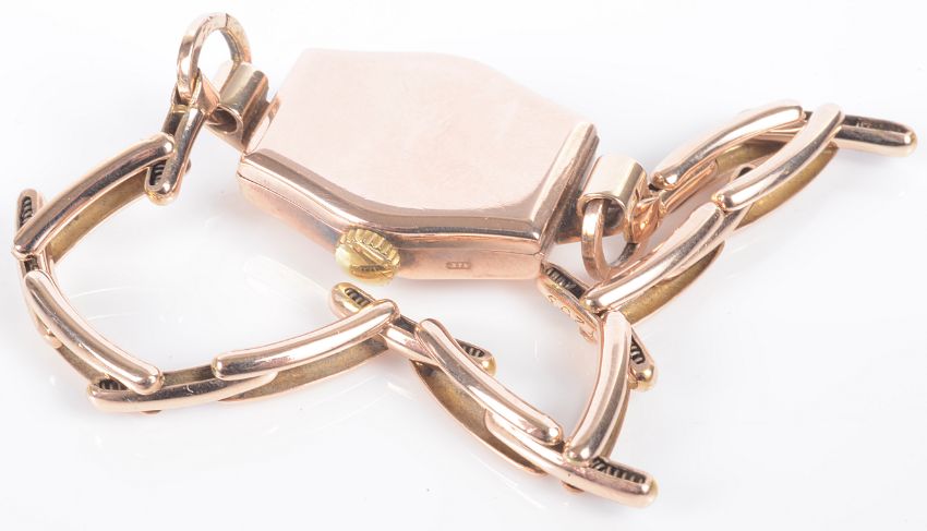 the dial with Arabic hours, spade hands, in a 9ct gold case, with 9ct elasticised link bracelet, case back numbered 753707 & hallmarked London 1937, bracelet numbered 854263, hallmarked 9ct B2A Britannic.