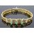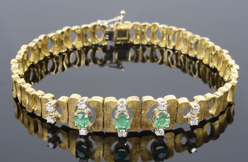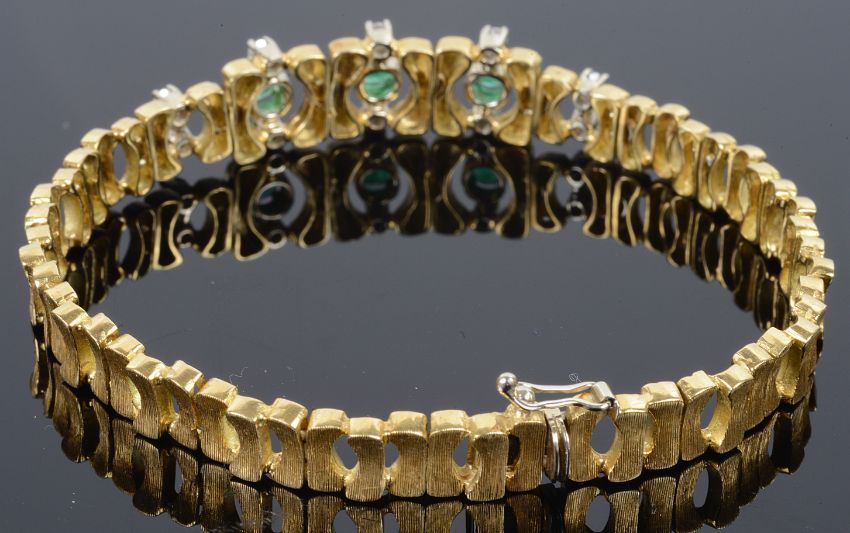 having three central emeralds with diamonds to either side and further diamond set links, the yellow metal fancy links with brushed textured finish, stamped 75 to invisible push clasp, tests for gold, circa 1960, associated box