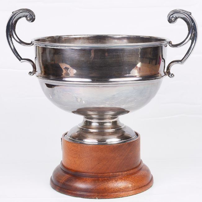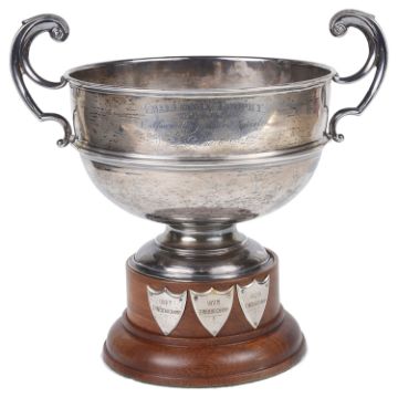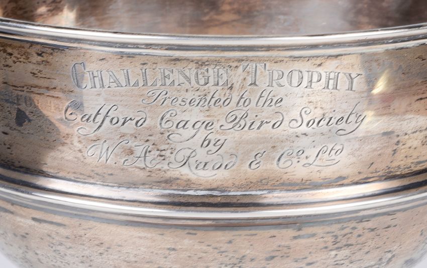the c-scroll twin handles on a bulbous body with pedestal circular foot ring, engraved ' Challenge Trophy presented to the Catford Cage Bird Society by W A Rudd & Co. Ltd', upon a mahogany base with silver-plated shield engraved plaques, hallmarked by W W Harrison & Co.