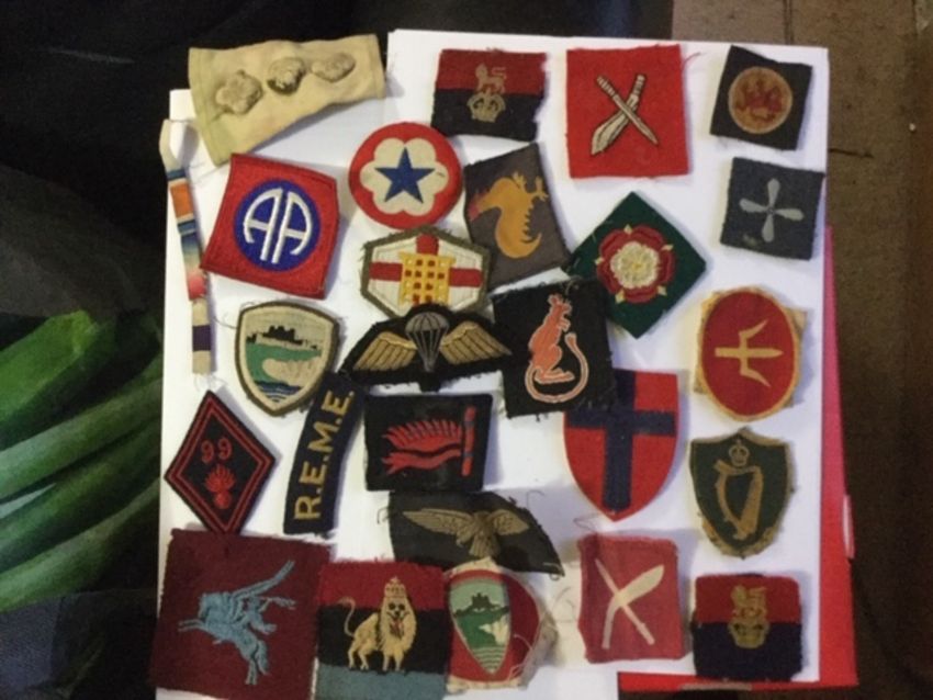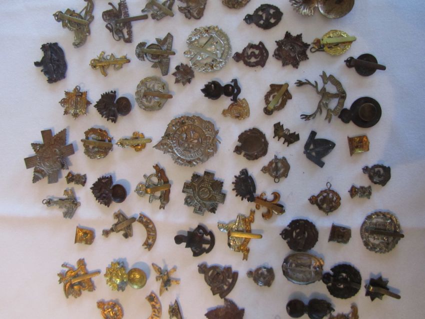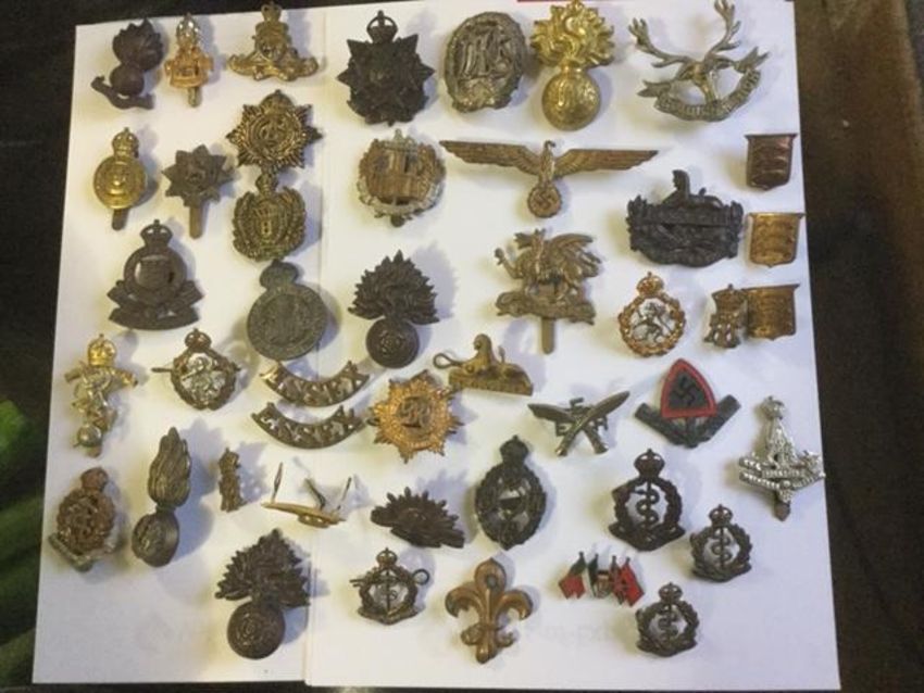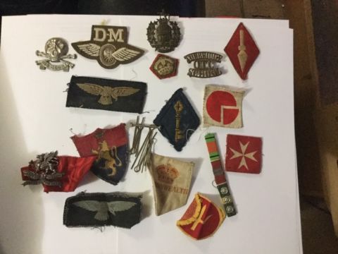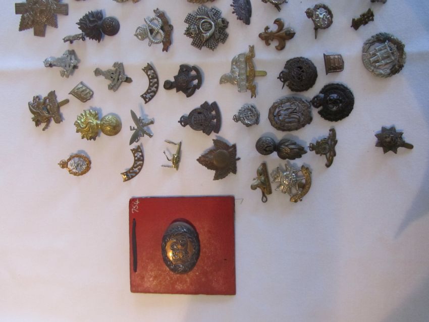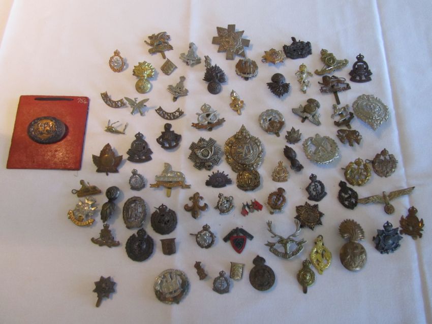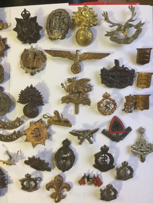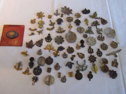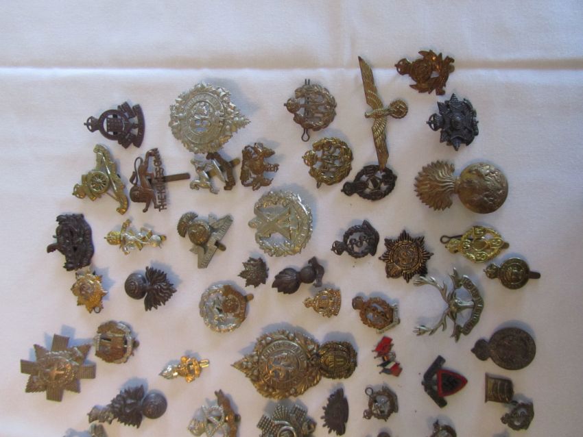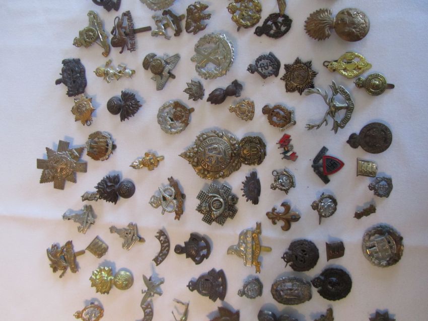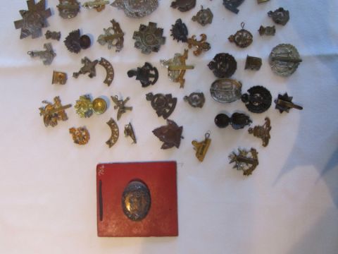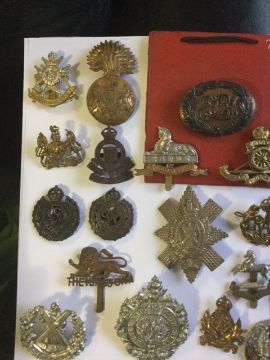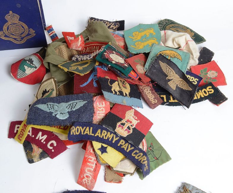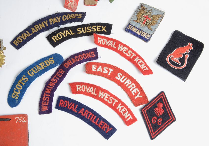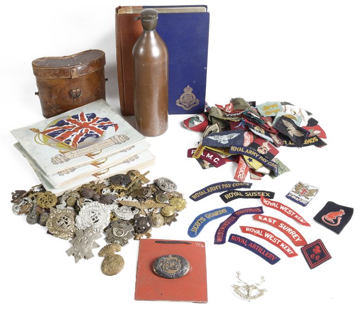 including a large collection of various mainly W.W.I regimental cap badges and plates and a wide range of cloth military insignias, W.W.I and W.W.II, also field binoculars, a Dunhill bridge top silver plated lighter, military cigarette cards and other items of military interest (qty)