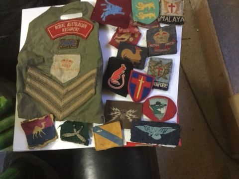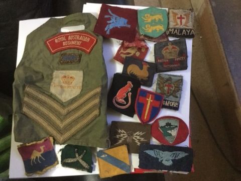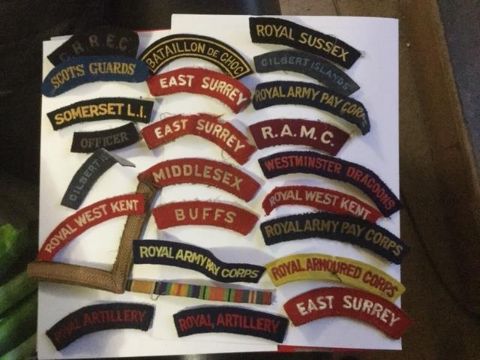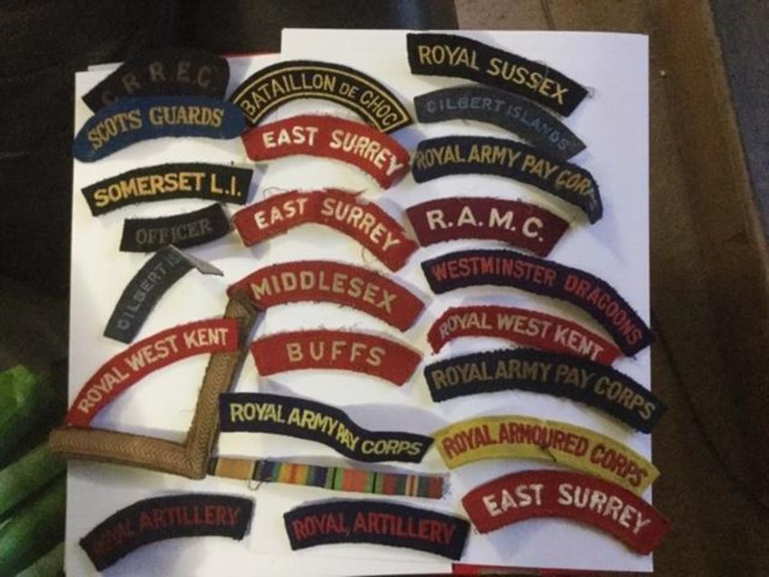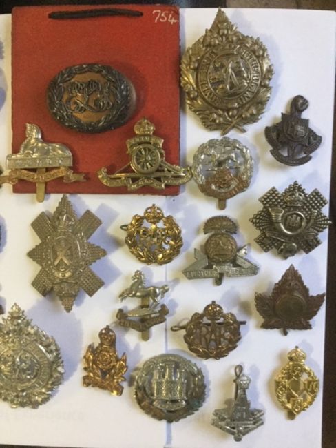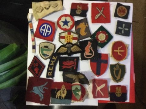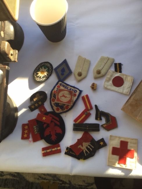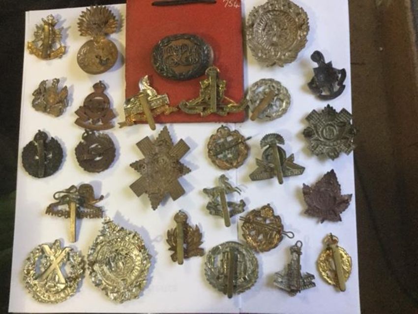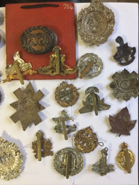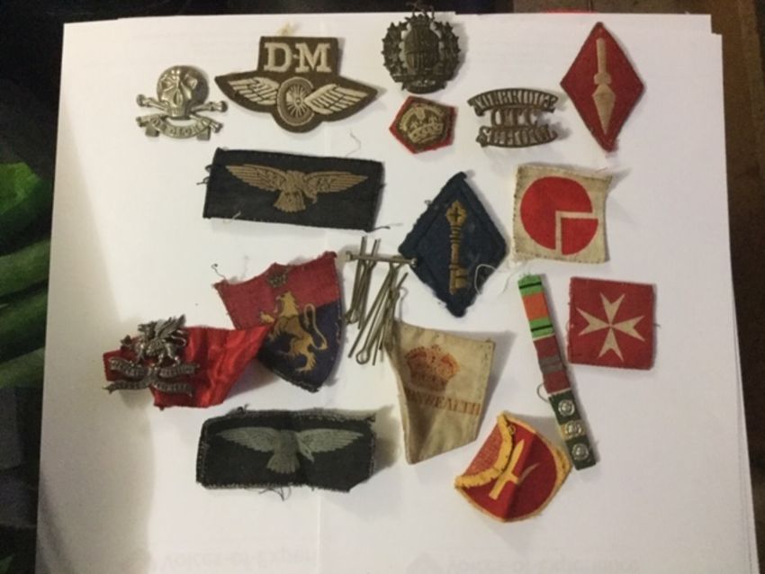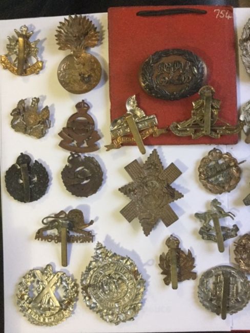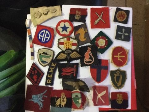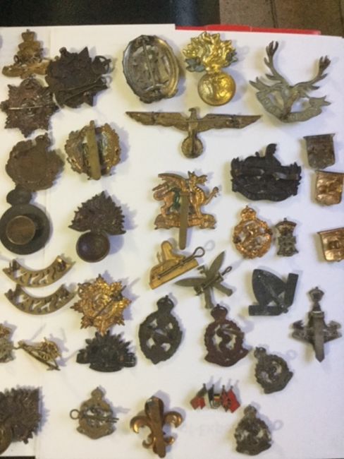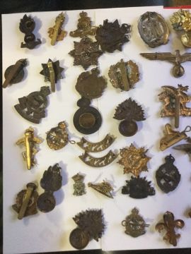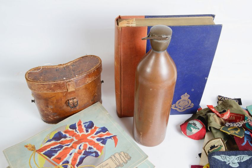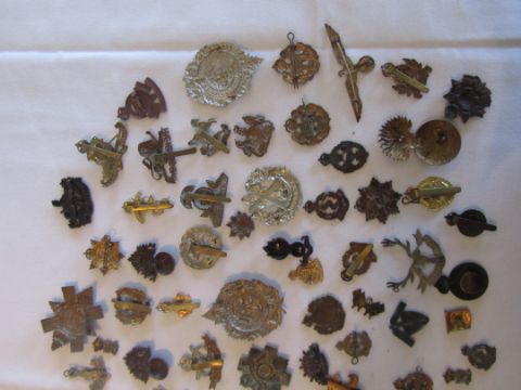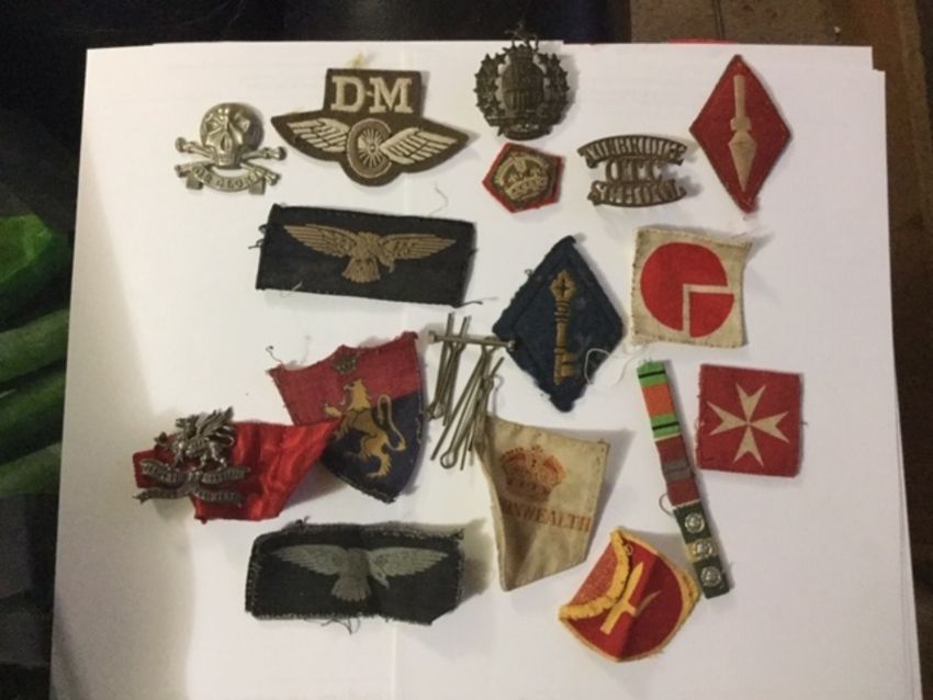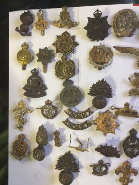 including a large collection of various mainly W.W.I regimental cap badges and plates and a wide range of cloth military insignias, W.W.I and W.W.II, also field binoculars, a Dunhill bridge top silver plated lighter, military cigarette cards and other items of military interest (qty)