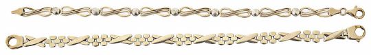 one having yellow gold stylised scroll links inter spaced white gold button links, the other having cross and gate links (2)