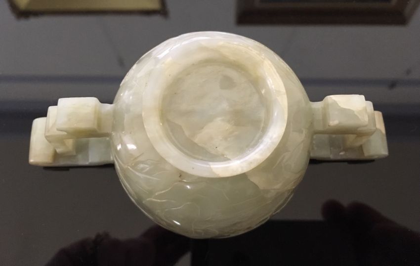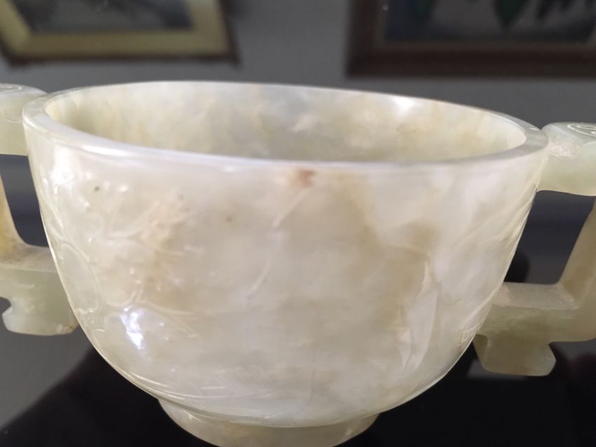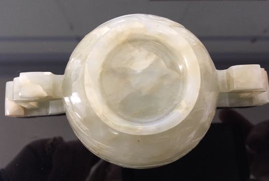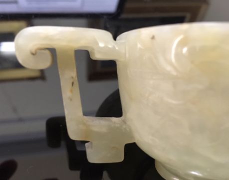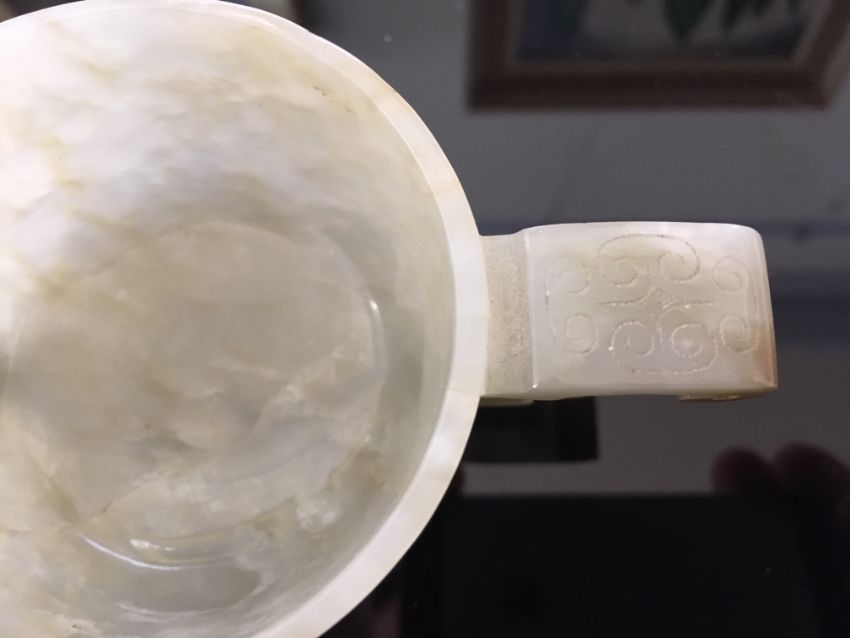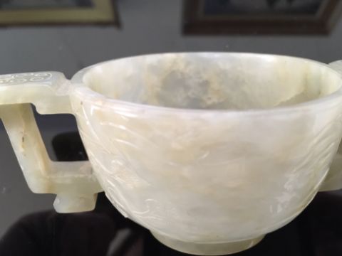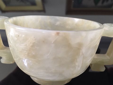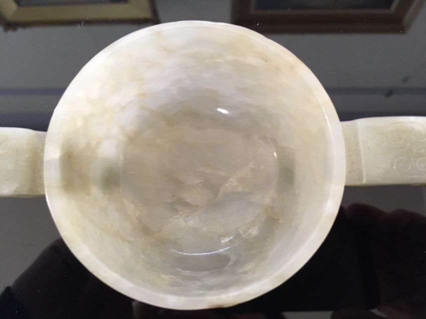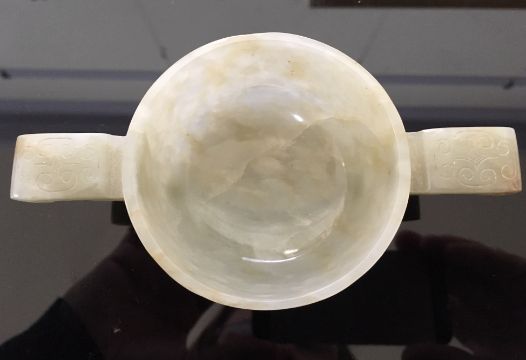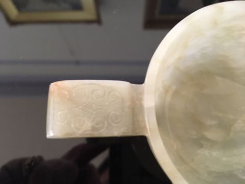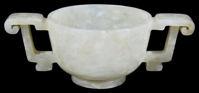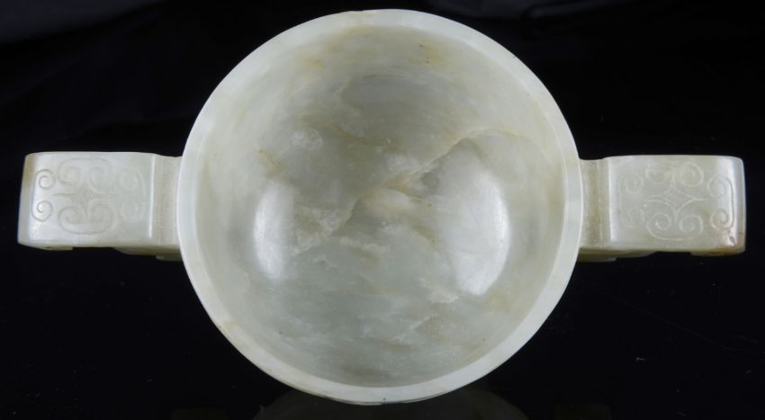 A Chinese pale celadon jade carved twin handled cup of archaic design