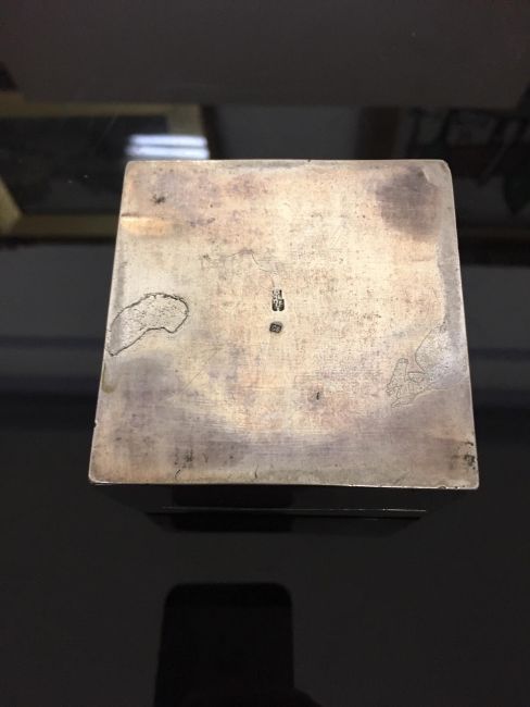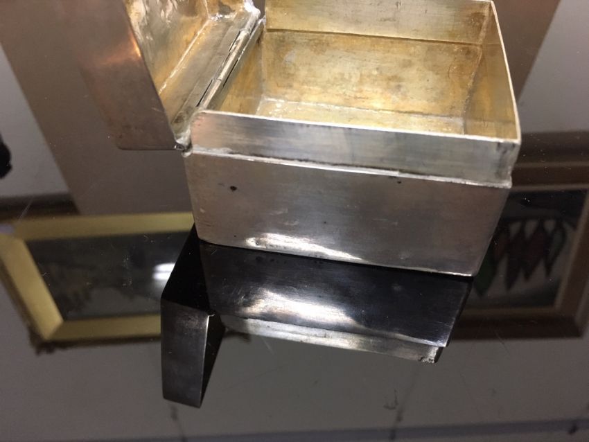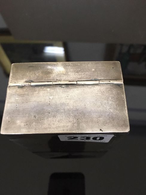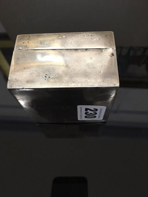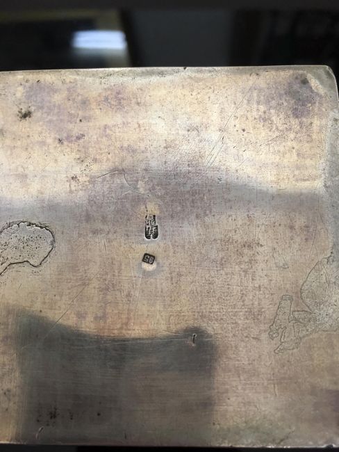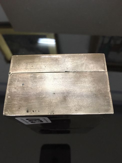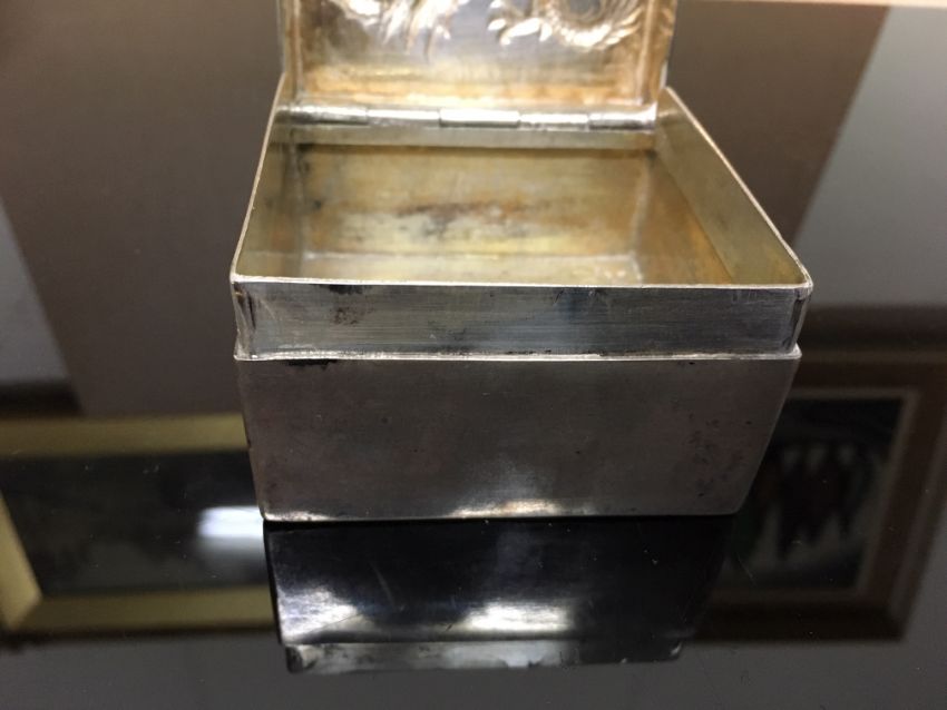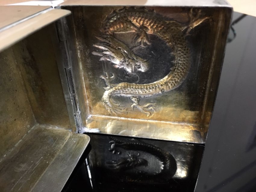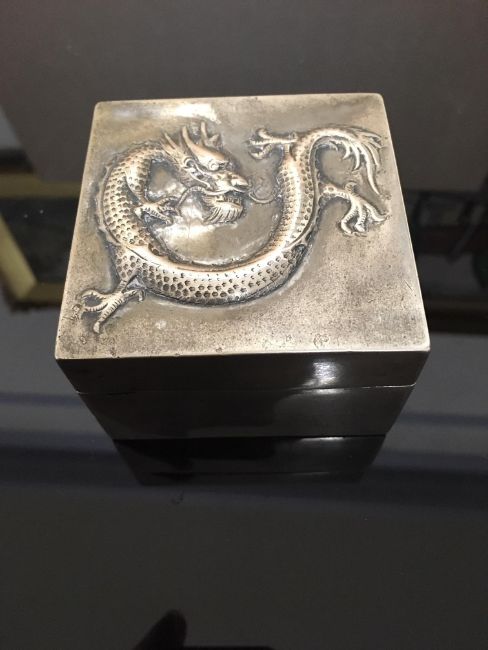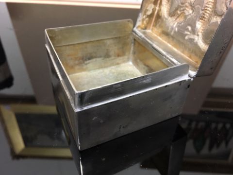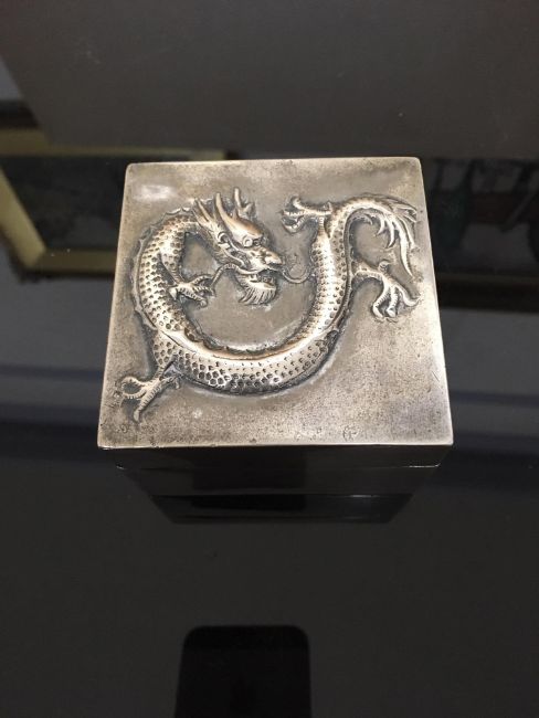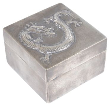of square form, the hinged lid embossed with a flaming dragon, bears 85 and character mark to base.