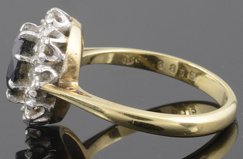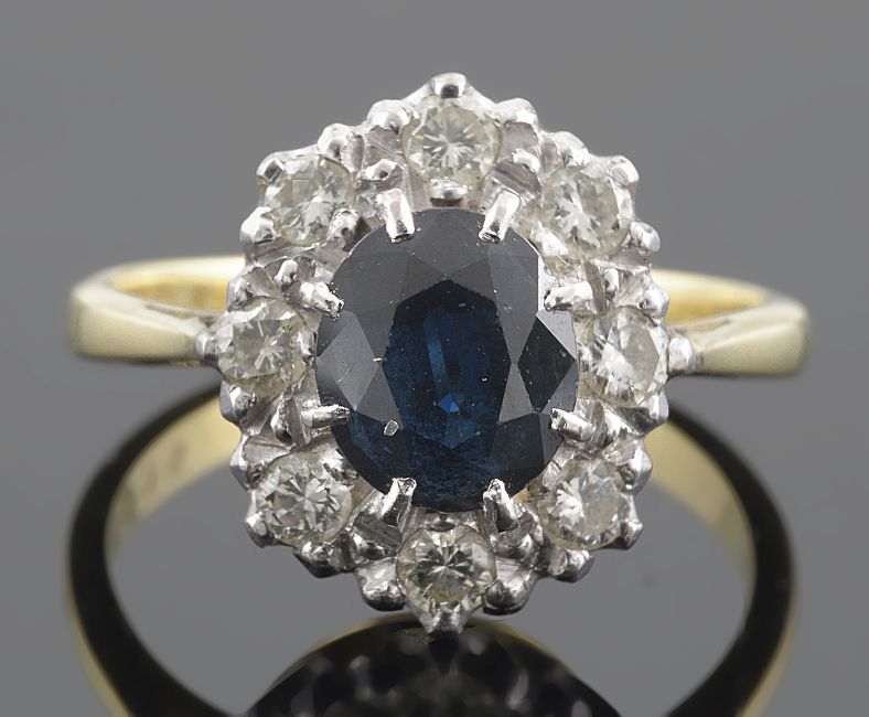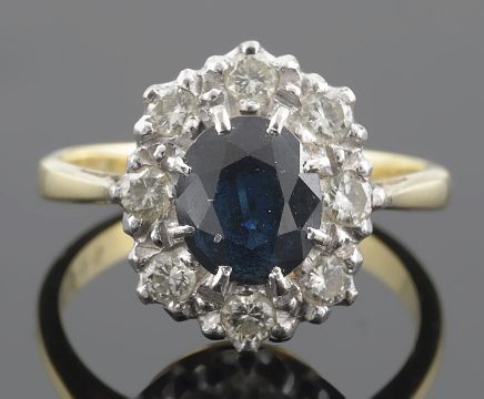 having central oval sapphire within a diamond set border, mount marked for 18ct and platinum