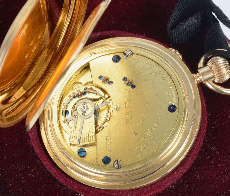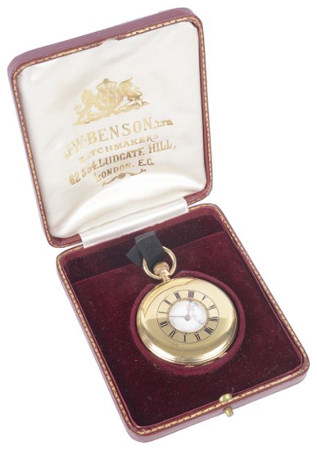 the white dial with Roman hour, seconds subsidiary dial and spade hands, the outer case with chapter ring of Roman hours, movement number: B7332, movement engraved The Field Best London Make By Warrant ti H.M. The Queen J.W. Benson Ludgate Hill, London, in its original red leather pocket watch box, the inner lid with gilt J.W. Benson Logo.