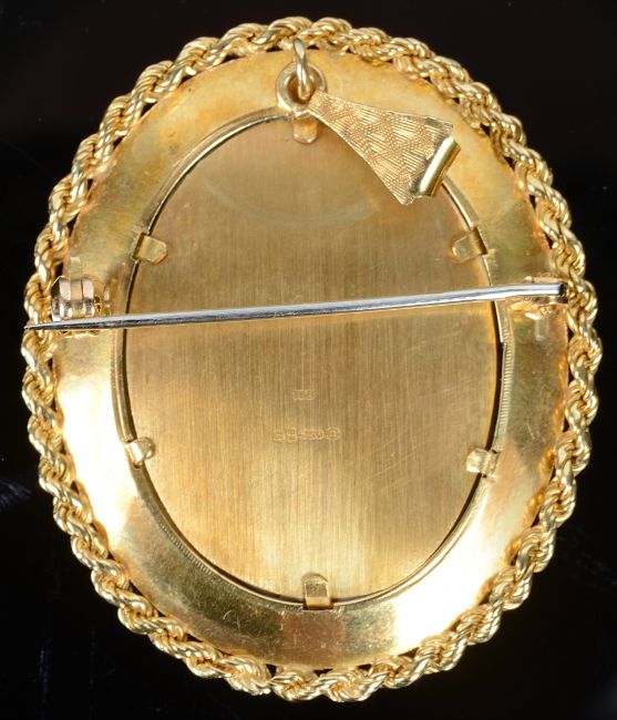 the oval mount with rope twist detail set with a portrait of an Elizabethan lady with lace ruff, her necklace and ear drops set with brilliant cut diamonds and with ruby to her décolletage, import marks to reverse, maker T&B