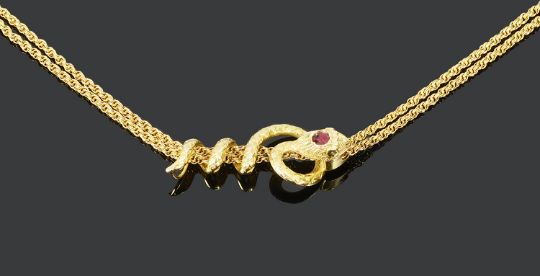 the double row rope twist chains threaded with a coiled serpent with ruby set head and overall engraved detail, impressed French gold marks