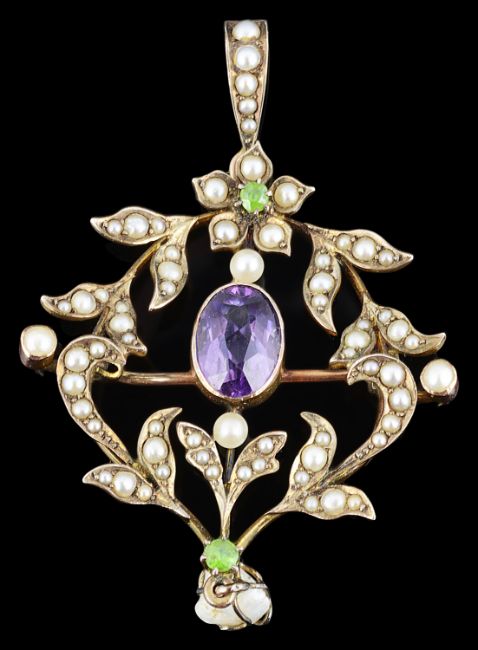 An attractive suffragette Art Nouveau amethyst, demantoid garnet and pearl set scroll pendant brooch