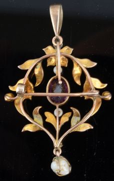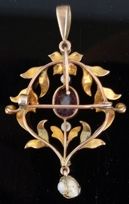 having central oval amethyst below a green garnet and seed pearl floral cluster and within a pearl set stylised foliate scroll pendant mount with baroque pearl drop below, detachable pearl set hanging loop and brooch fitting, yellow metal mount tests for gold