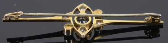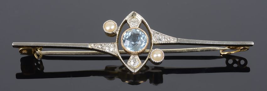 having central aquamarine within small diamonds mount to top and bottom and diametrically opposed half pearl and rose diamond detail, tests for gold, associated box
