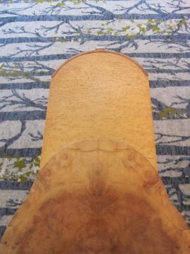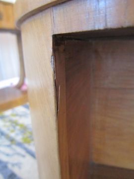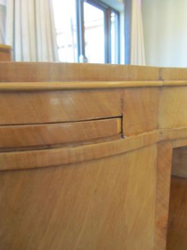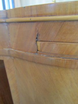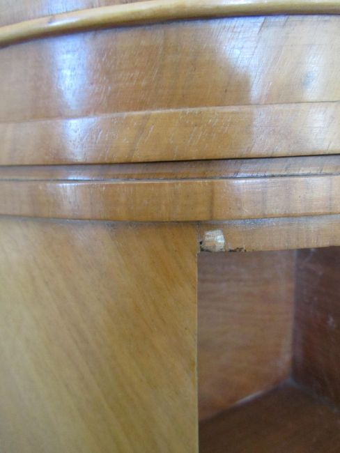 Condition: Wear and surface scratches throughout, the top and body is faded throughout, there are splits in the veneer at the sides of one of the slides, there is a piece of veneer missing from below one slide and veneer loose in one of the end wells.