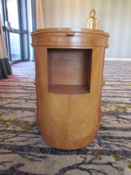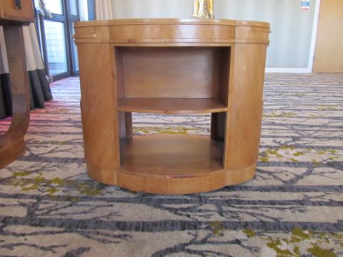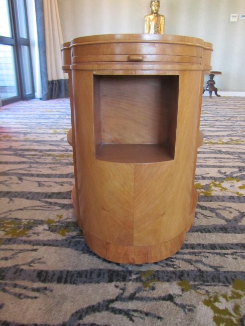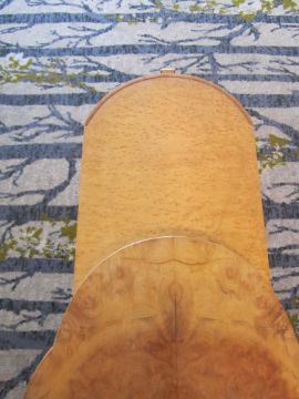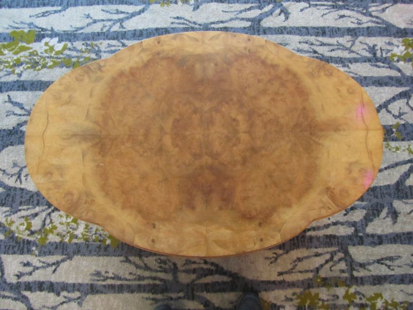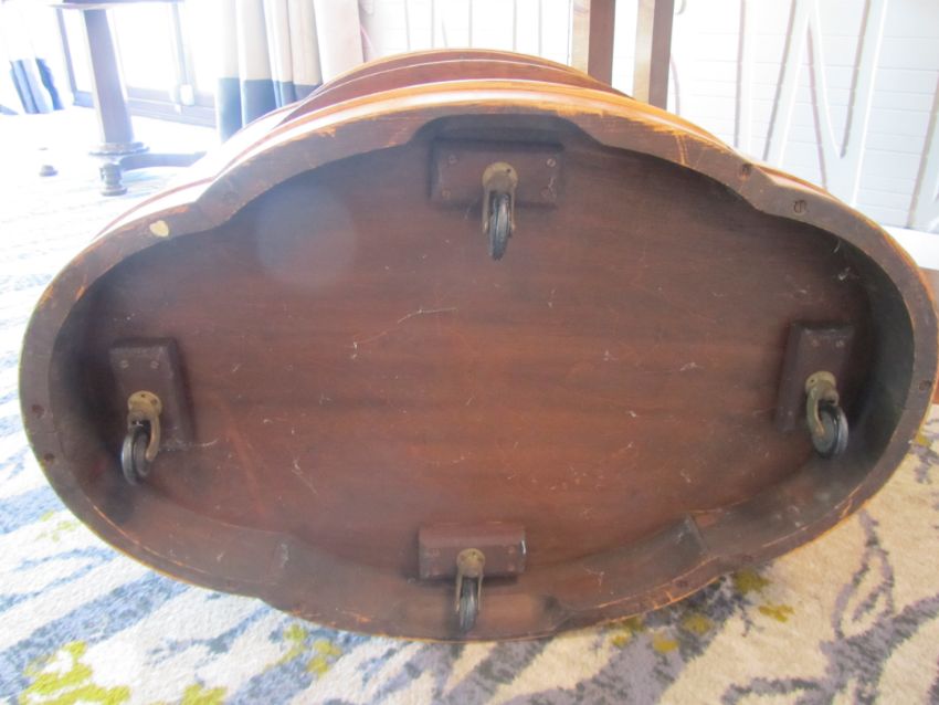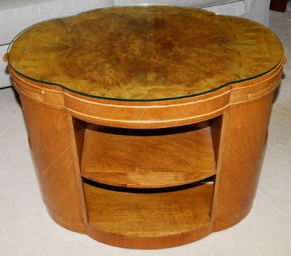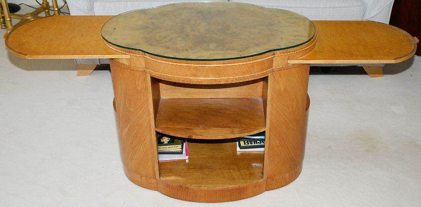 the quatrefoil shaped table with pull out extendable bird's eye maple slides, with two shelves and two end wells, with a glass top.