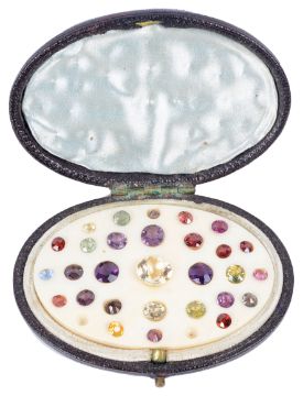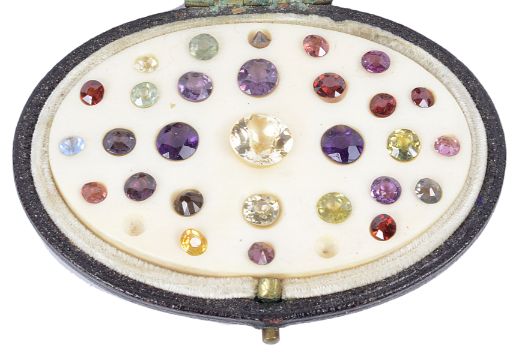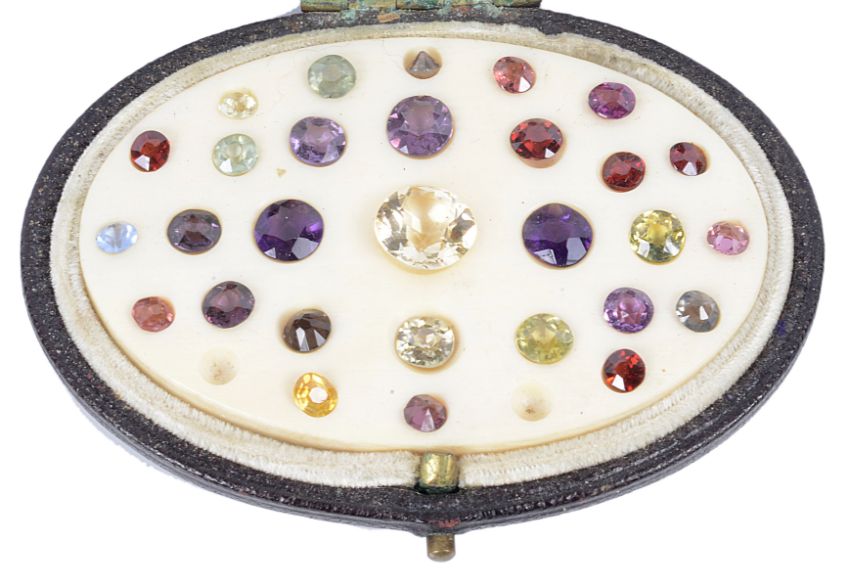 the carved ivory oval fitted in a hinged leather case and having a mixed selection of facetted gems including amethysts, spinels, garnets and citrines of varying sizes
