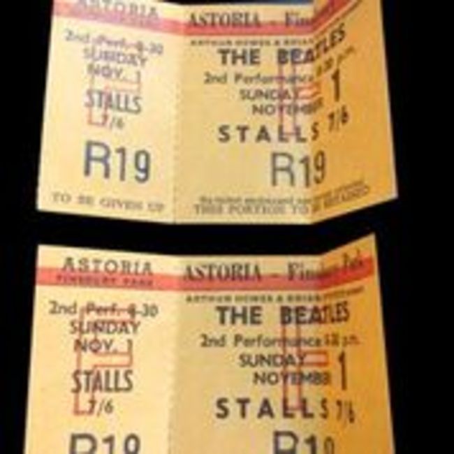 Condition: tickets in very good condition although one has the number 10 written on in pencil, the calendar is in fair condition with some discolouration to the cover and pencil markings on several interior dates. Postcards in fair condition with what appear to be watermarks on the reverse and bending to edges, the photographic print of the group has damage on the reverse due to wall hanging and a large tear, some bending and creasing to the John Lennon picture.