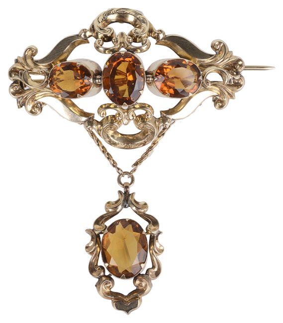 the brooch of diamond shape and having three central oval citrines within an ornate scroll mount with engraved detail and having detachable scroll pendant suspended from fine chains, tests for gold, circa 1860