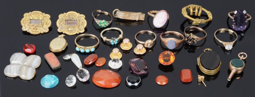 including a pair of Georgian memorial hair set gilt brooches, a turquoise and seed pearl set 'forget me not' ring, various gold and other rings, a quantity of carved hard stones, lockets etc... (qty)