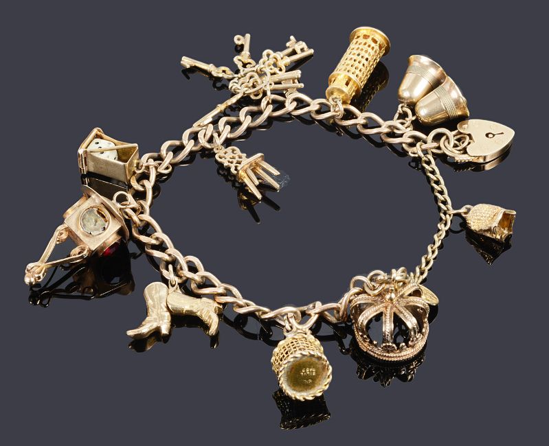 the bracelet marked .375 for 9ct gold and suspended with an interesting collection of charms (mainly 9ct) including a chair, crown, set of keys, a silver and gold rabbit in a basket and others