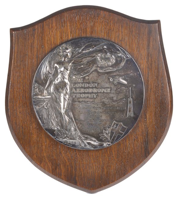 the silver circular plaque with a classical figure holding a wreath above a flying aeroplane and signal tower, hallmarked Birmingham 1913 by G Halliday, presented for the 2nd annual swimming gala for the employees and staff of the Grahame-White Company held at the Hampstead Baths on Saturday 28th September 1918, Mr H Stewart won the Challenge Cup of the scratch 440 yards race and the prize was presented by Mrs Grahame-White at the concert which was held in the mess-room of the company on 18th October 1918.