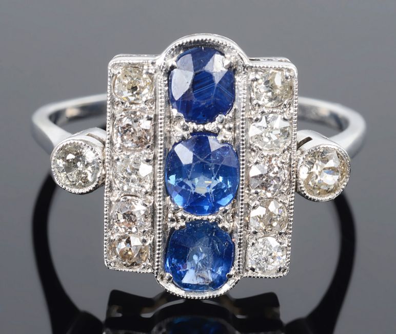 the white gold mount having three central sapphires between diamond set panels and with single diamond set shoulders, stamped to inside mount S.U? 18ct & plat
