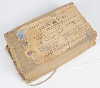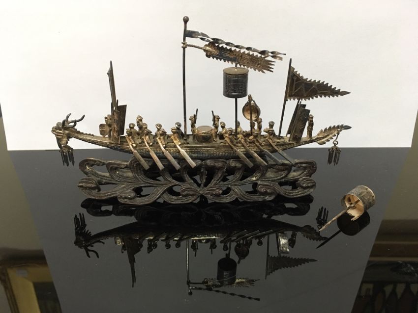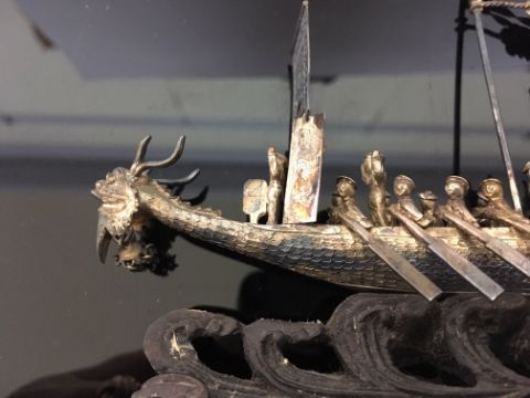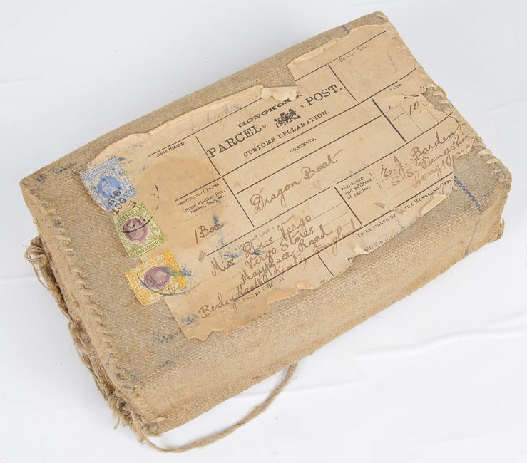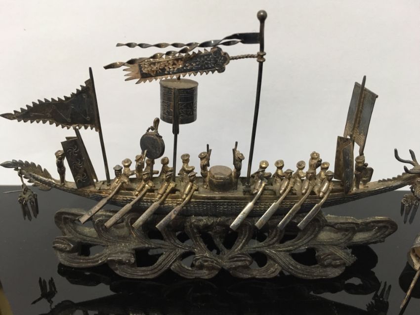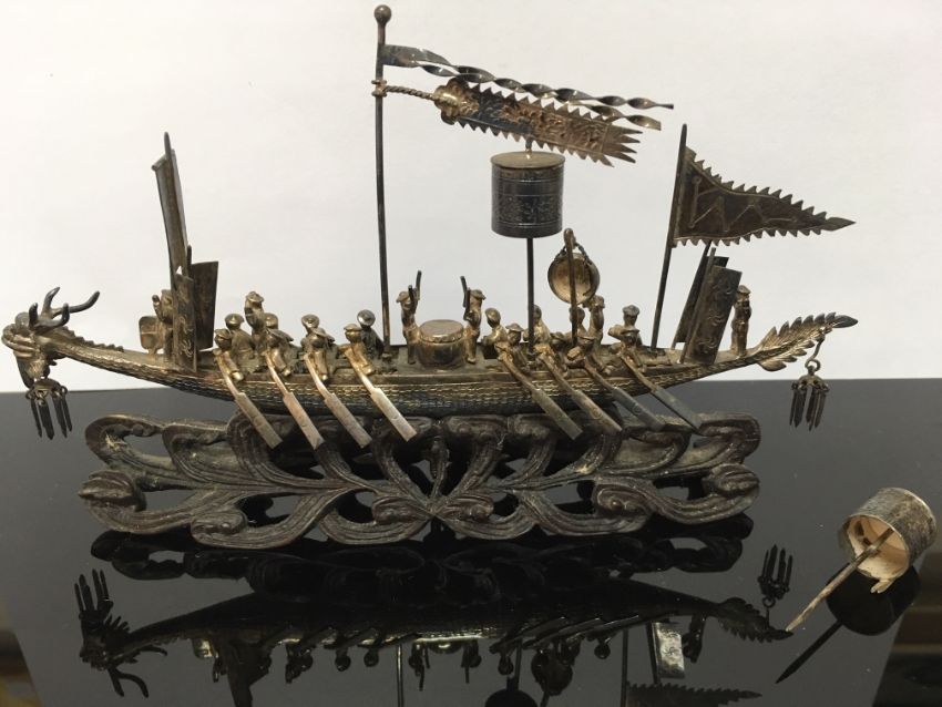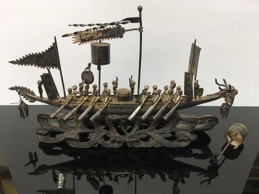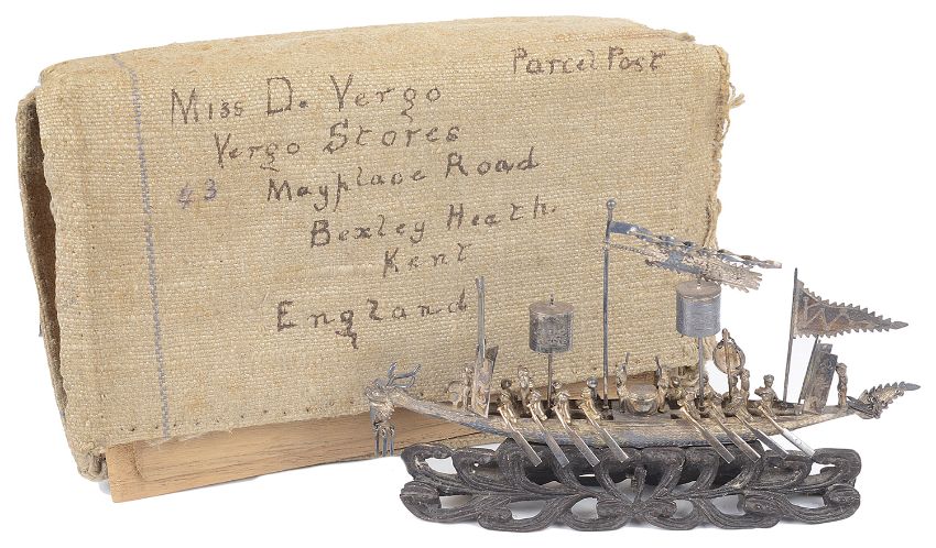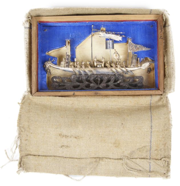 modelled as a dragon boat with rowers and musicians, flag and pendants, raised upon pierced scrolled hardwood base, bears character marks and initials, in the original wooden fitted box, with original canvas parcel post cover with written address and postage label from Hong Kong dated Oct 1919.