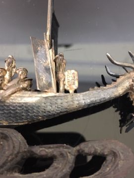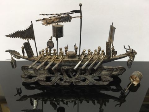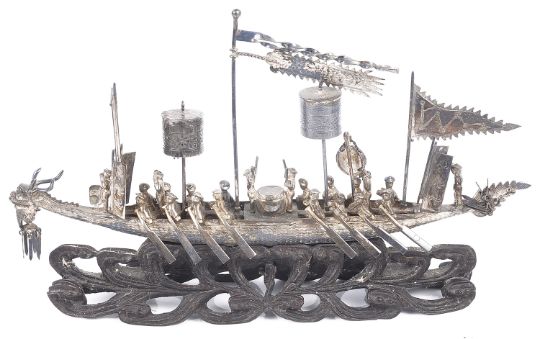 A Chinese Cumow silver model of a dragon boat in original postage bag, mid 19th century