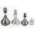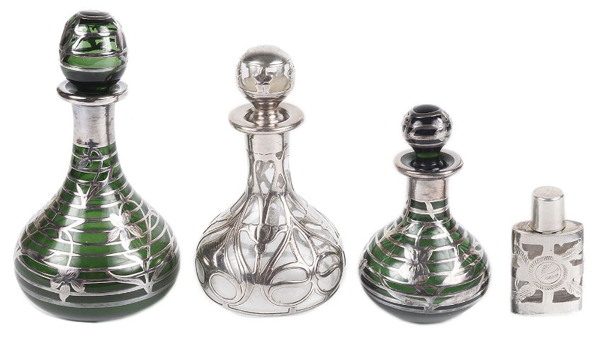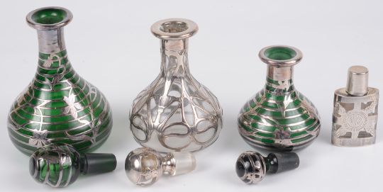Two early 20th century green glass and white metal overlay perfume bottles and two others