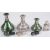 the two green bottles with overlay foliate decoration and stoppers, together with a clear glass bottle with similar decoration and stopper, and a small clear glass bottle of rectangular form with banded overlay and screw top (4)