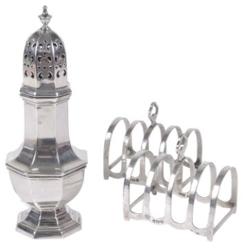 of typical form with trefoil handles by Barker Brothers Silver Ltd; together with a silver caster, hallmarked Sheffield 1936, of typical form with faceted bulbous body and pierced lid by Walker & Hall, (3).