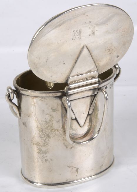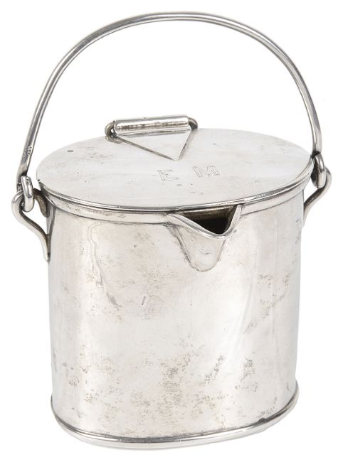 of oval form with hinged lid, swing handle and spout, the reverse with u-shaped clip, with the lid engraved 'E.M', possibly by Jacob Berman.