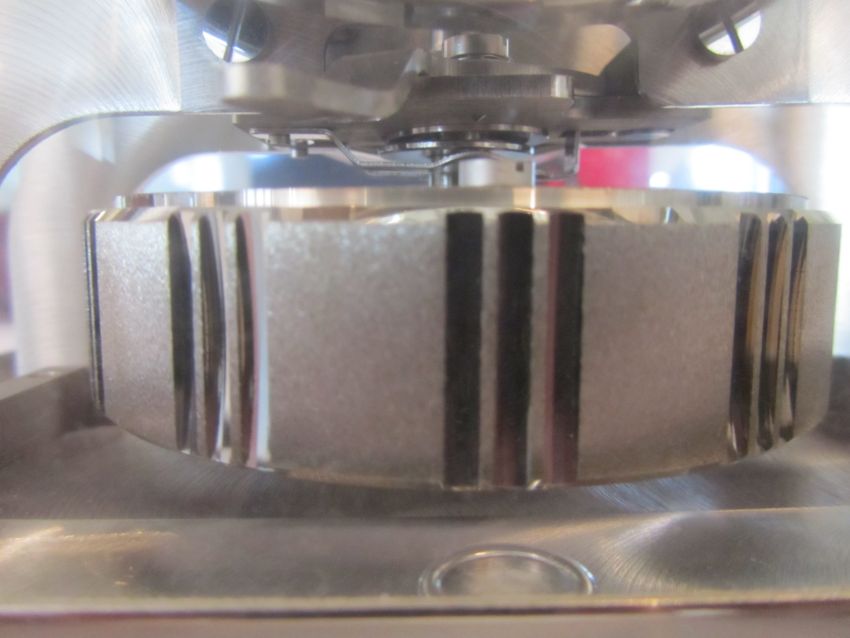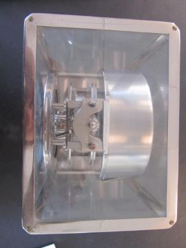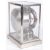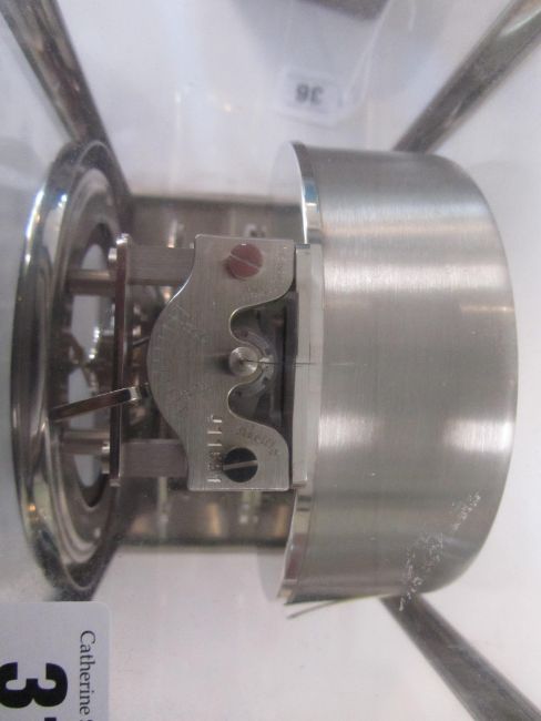 of rectangular form with silvered chapter ring, Arabic quarter hours and applied dagger markers, with dagger type hands, contained in a five glass and silvered case, front opening door, upon a silvered rectangular base, Serial No. 411551