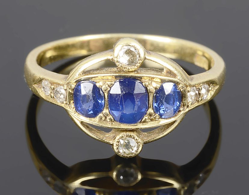 having three central sapphires of good colour within single stone diamond set loops and with rose diamond set shoulders, mount stamped 18ct