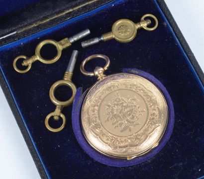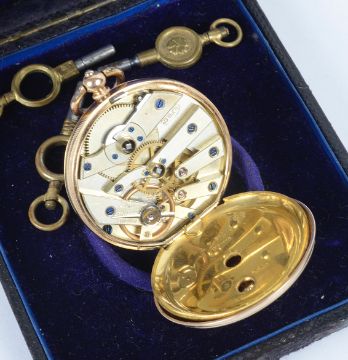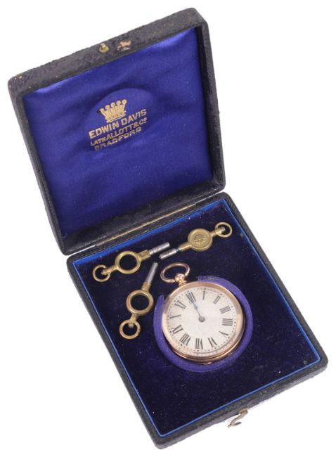 the dial with Roman hours and spade hours, in circular case with foliate engraved back, with associated watch keys and in associated watch box.