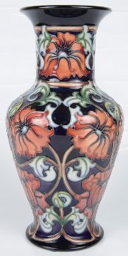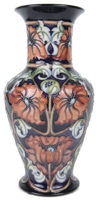the flared rim above elongated neck with tapered baluster body, tube lined decoration of poppies and scrolling leaves, painted and impressed marks to base, Limited Edition 76 of 150, in original box.