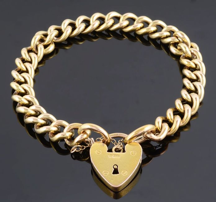 the bracelet stamped 15C and testing for gold and with hallmarked 15ct gold heart padlock fastening, with safety chain