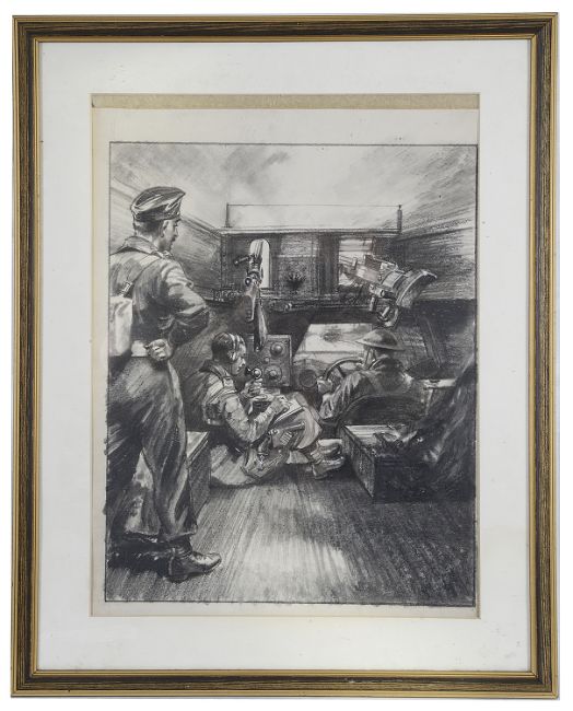World War II charcoal sketch of servicemen in a military vehicle, signed lower margin 'drawing by C E Turner after the original sketch by Capt. B de G ? own sketch War Correspondent in France', mounted and framed