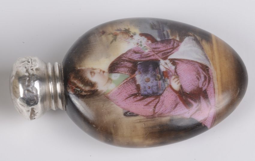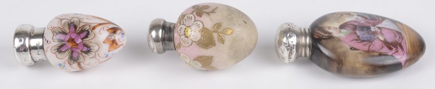 the first Victorian bottle in the form of an egg and hand painted with flower spray, the second of similar form with silver top initialled CM the last of flat ovoid form delicately painted with a Geisha girl (3)