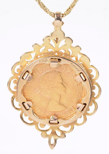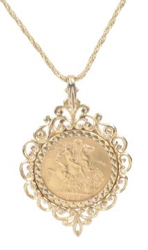 A Elizabeth II full sovereign in a 9ct gold pendent mount with 9ct fine rope twist chain,