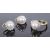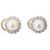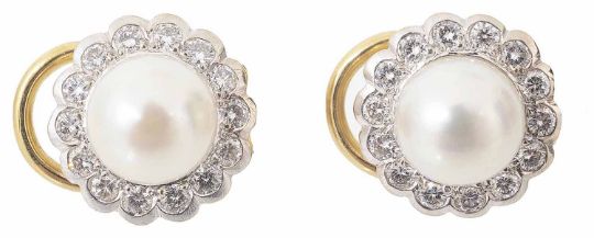 the pearls set within small bright diamond circular borders, mounts marked for 18ct gold, associated boxes (2)