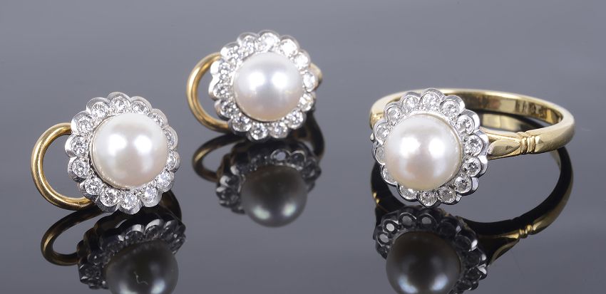 Condition: Overall good, no scuffing or rubbing to pearl, diamonds white bright and lively