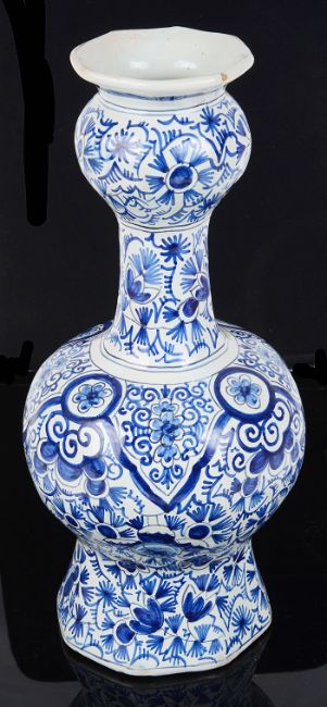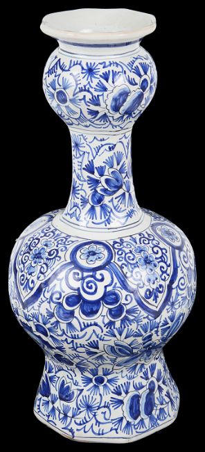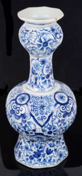 A Dutch Delft blue and white garlic necked octagonal bottle vase