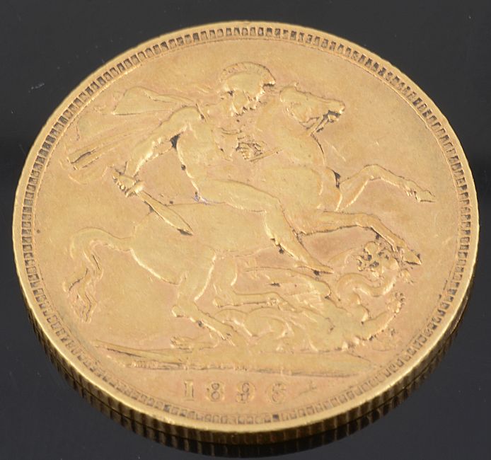 gold coin 0.916, Obverse: Older veiled bust of Queen Victoria left, VICTORIA.DEI.GRA. BRITT.REGINA.FID.DEF. IND.IMP; Reverse: Saint George slaying the dragon right, date in exergue 1896.