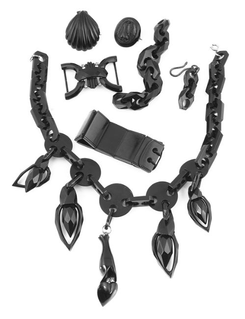 Condition: Necklace overall good, some chipping to serpent mouth and repair to jet suspension loop above, some chipping to scallop brooch reverse edge, bracelet some chipping to edges
