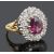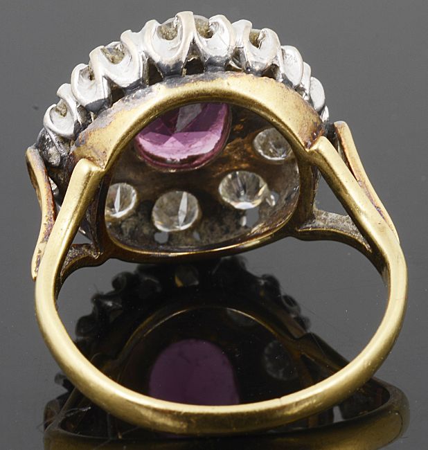 A large pink gem and diamond set oval cluster ring