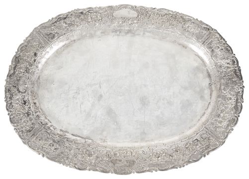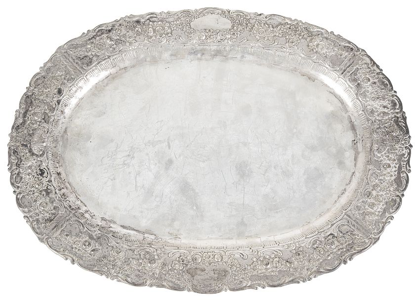 of oval from, rim embossed with c scrolls and garlands of flowers