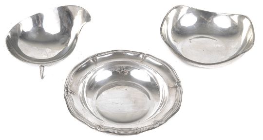 one of teardrop form raised on feet, the other with wavy edged rim, both marked sterling 925 together with a German 800 silver dish with pie crust rim (3).