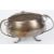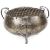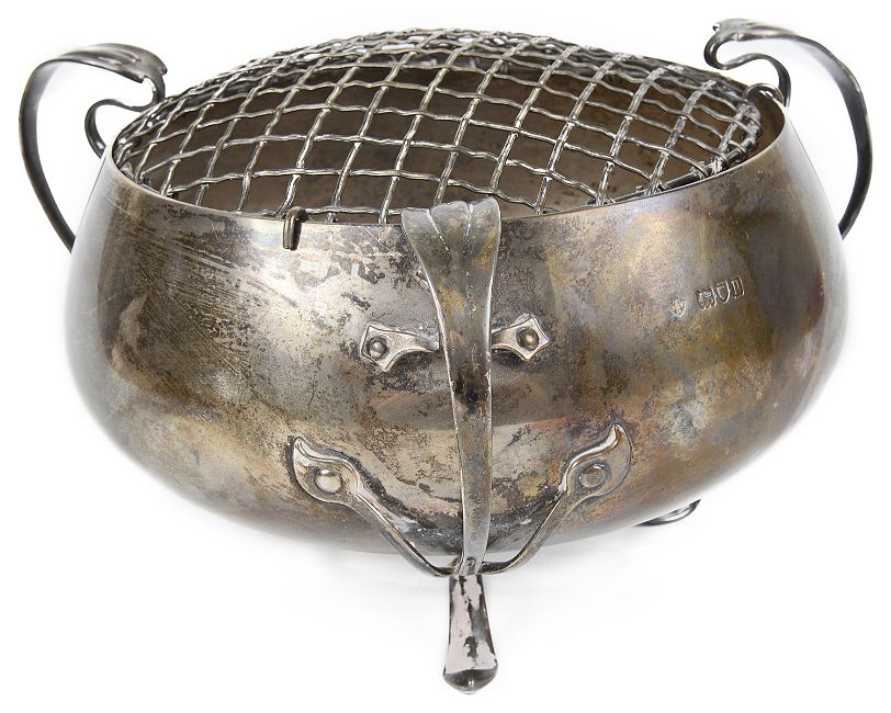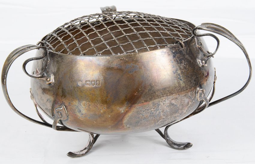 the circular bowl with three tendril scrolled handles and supports, with metal mesh rose holder.