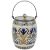 the cylindrical barrel with EPNS collar, swing handle and circular removable lid, the body incised with blue, tan and green leaf and border decoration, impressed and incised marks to base.