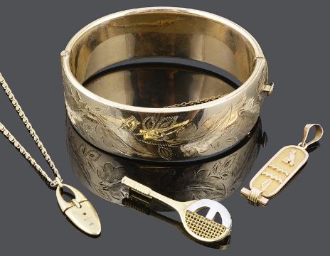 together with a stylised two colour 18ct gold tennis racket brooch , a Continental two colour Egyptian hieroglyph pendant, tests gold, a yellow metal chain, tests for gold and a scroll engraved 9ct & metal core hinged bangle, (5).